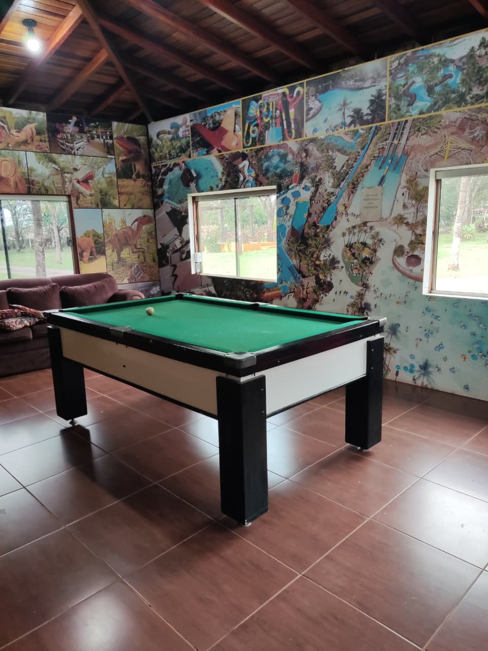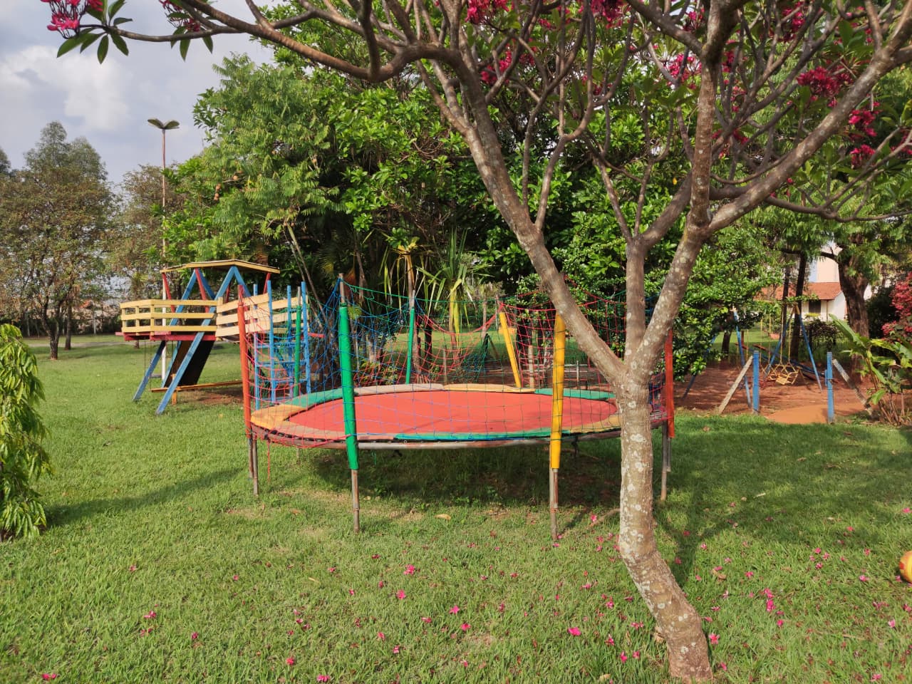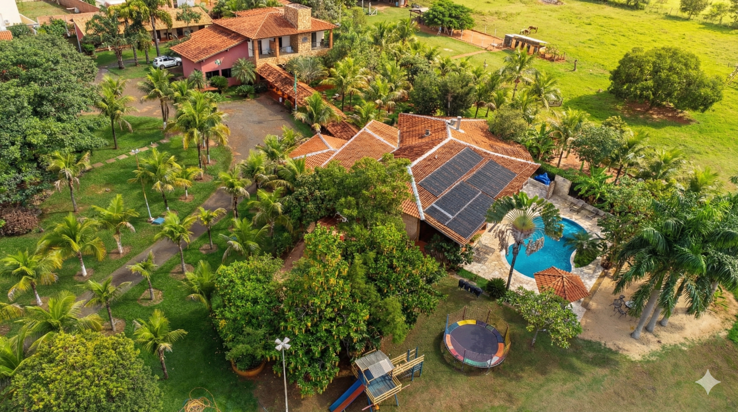 Aqui, você pode relaxar na piscina, jogar bola no campo, aproveitar o lounge com jogos ou deixar as crianças se divertirem no playground.
